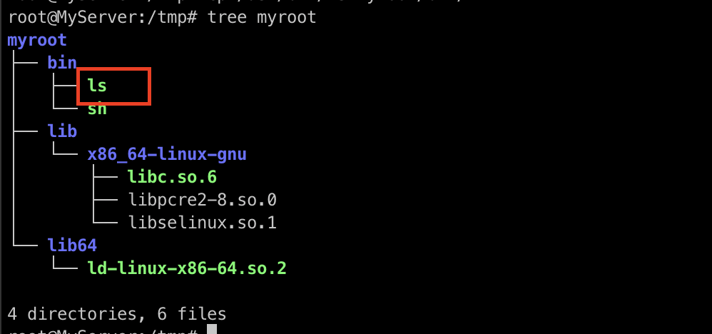 tree 명령어를 통해 myroot의 구조를 살펴보면 /bin/ls와 함께 의존성들이 복사된 것을 확인할 수 있습니다.