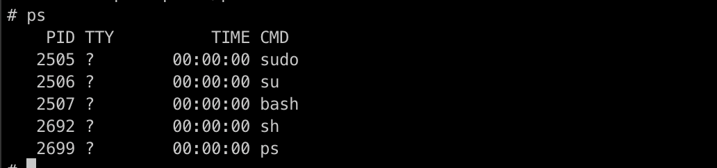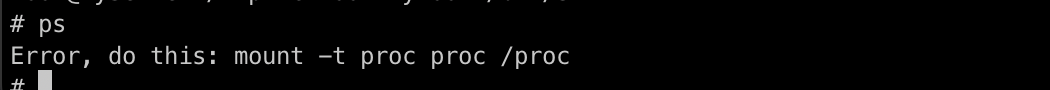 /proc가 mount되어 있기 때문에 ps 명령어를 실행했을 때 mount된 경로에서 확인할 수 있었습니다. 하지만 chroot로 접근한 쉘에서는 해당 mount 작업을 해주지 않았기 때문에 동작하지 않았습니다.