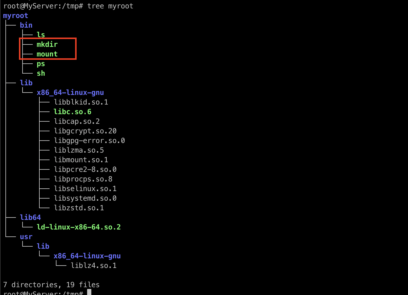 cp /lib/x86_64-linux-gnu/{libmount.so.1,libc.so.6,libblkid.so.1,libselinux.so.1,libpcre2-8.so.0} /tmp/myroot/lib/x86_64-linux-gnu/;