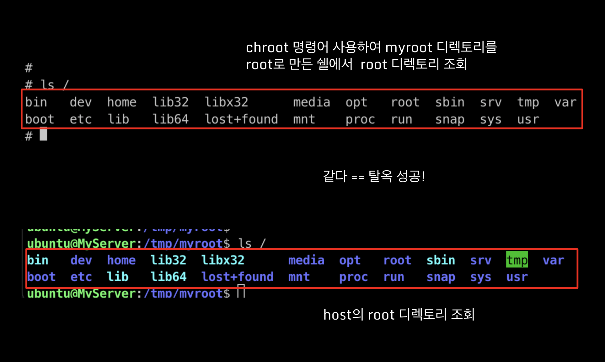 탈옥 파일을 실행한 후 ls 명령어를 통해 /(root) 경로를 확인해보면 위와 같이 host에서 root 경로를 조회했을 때와 같은 파일목록을 확인하실 수 있습니다.