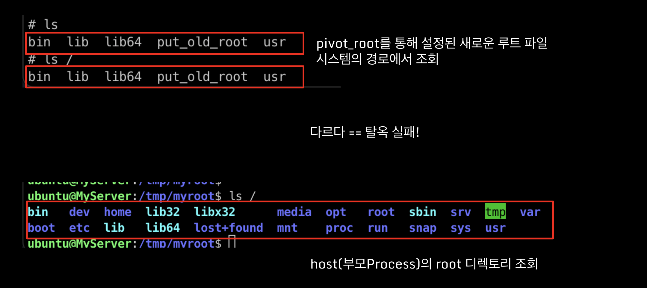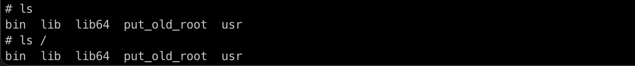 사용법은 정말 간단한데요. 위의 명령어처럼 pivot_root 명령어를 통해 현재 경로에 기존 root를 넣어줍니다. pivot_root 는 실행 시, 변경될 root 파일시스템 경로로 진입하게 됩니다.