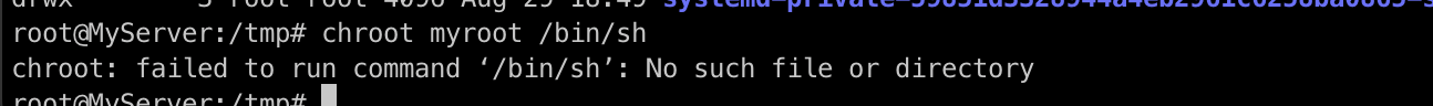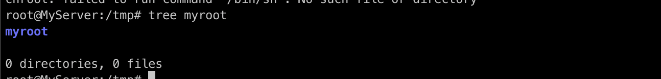 tree 명령어를 통해 살펴보면 현재 myroot는 빈 Directory인 것을 확인할 수 있습니다. 그렇기 때문에 위에서 실행한 /bin/sh가 실행이 안된 것인데요.