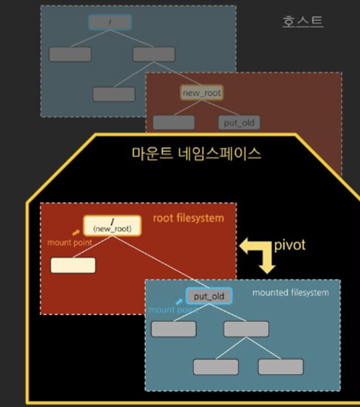 즉, pivot_root는 기존의 root filesystem을 새로운 위치로 이동시키고, 새로운 root filesystem을 루트로 설정하여 두 파일 시스템 간의 루트 디렉토리를 전환합니다.