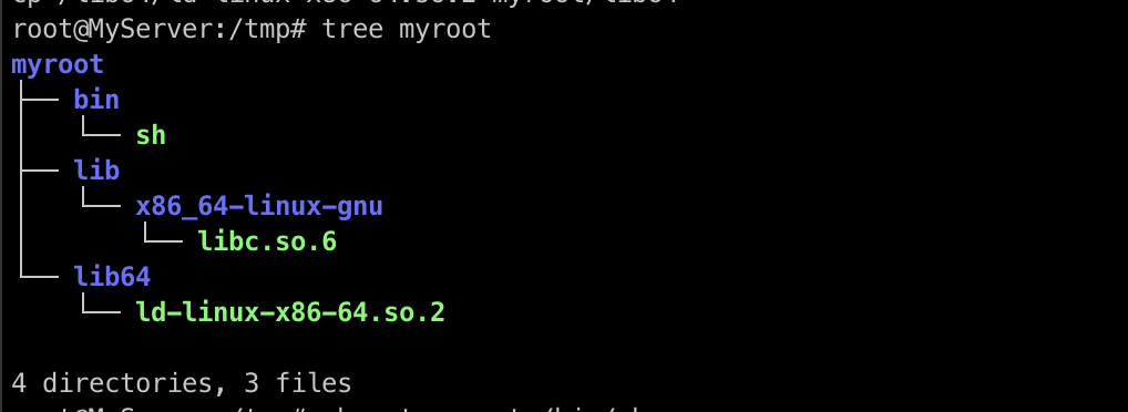 cp /lib64/ld-linux-x86-64.so.2 /tmp/myroot/lib64/;