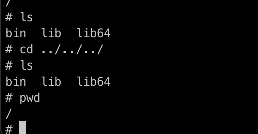ls 명령어를 통해 현재 경로와 / 경로의 파일 목록을 출력해봐도 절대 상위 경로로 이동하지 않습니다. 즉, 부모 namespace의 root 경로로 이동하지 못합니다. -> 탈옥 실패!