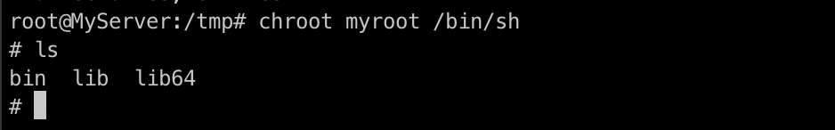 다시 chroot 명령어를 통해 myroot 디렉터리를 새로운 루트 디렉터리로 설정한 후 그 환경에서 shell을 실행합니다.