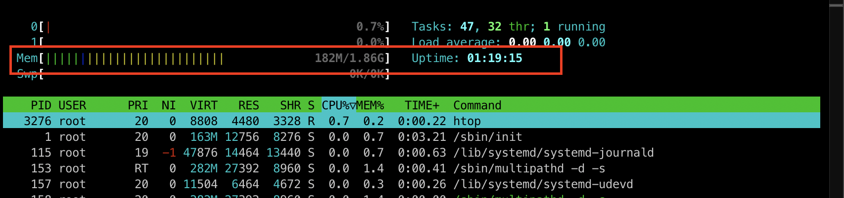 [터미널2] htop 명령어를 통해 리소스 확인