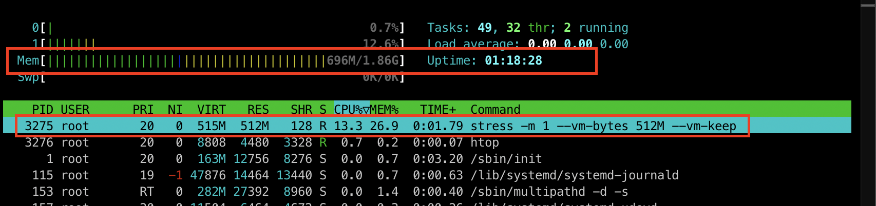 부하를 주입하고 난 후 htop 명령어를 통해 리소스 사용량을 확인해보니 696M 정도 사용하고 있는 것을 확인하실 수 있습니다.