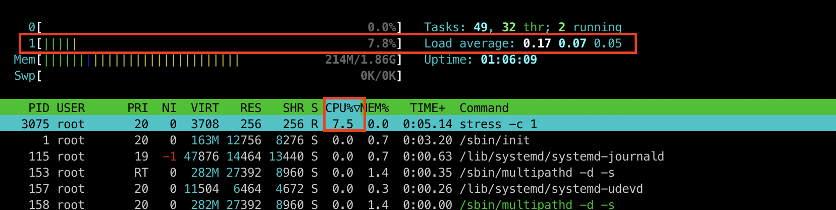 [터미널2] htop 명령어로 부하 확인
