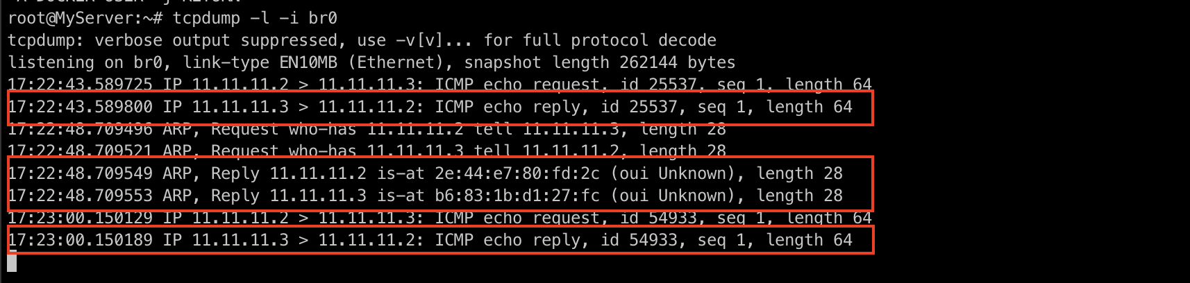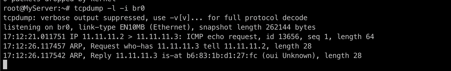 통신 패킷을 확인하기 위해 br0에 tcpdump를 설정합니다.