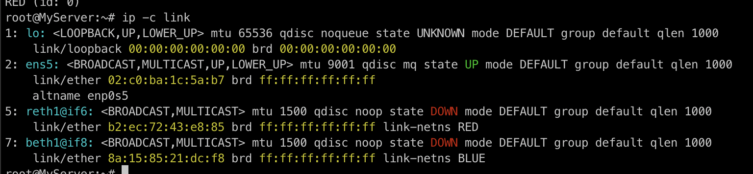 ip netns exec RED  ip link set reth0 up; ip link set reth1 up