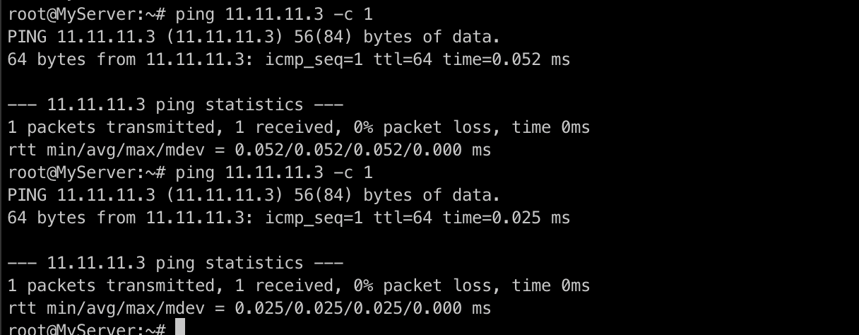 RED Network Namespace에서 BLUE Network Namespace의 IP인 11.11.11.3으로 icmp 통신을 보내보도록 하겠습니다.