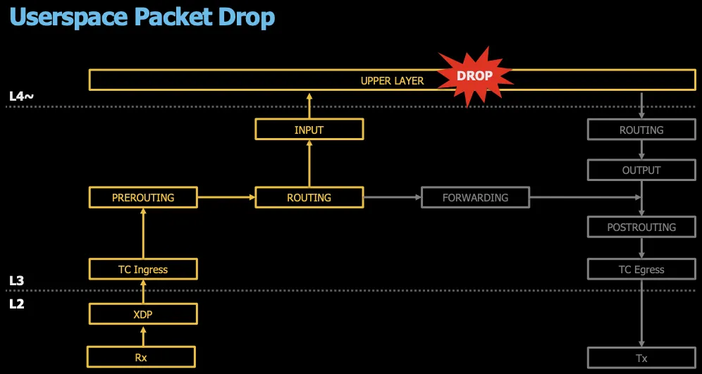 UserSpace Layer에서 패킷을 차단할 경우의 경로를 살펴보면 하드웨어단에서 인입되어 TC Ingress를 걸쳐 Iptable rule에 통해 전달되고 최종으로 애플리케이션단에서 차단됩니다.