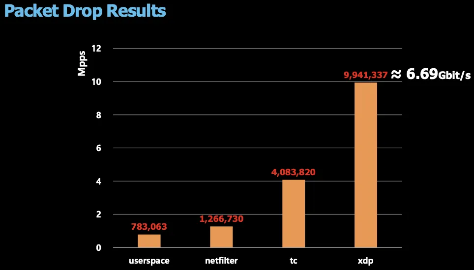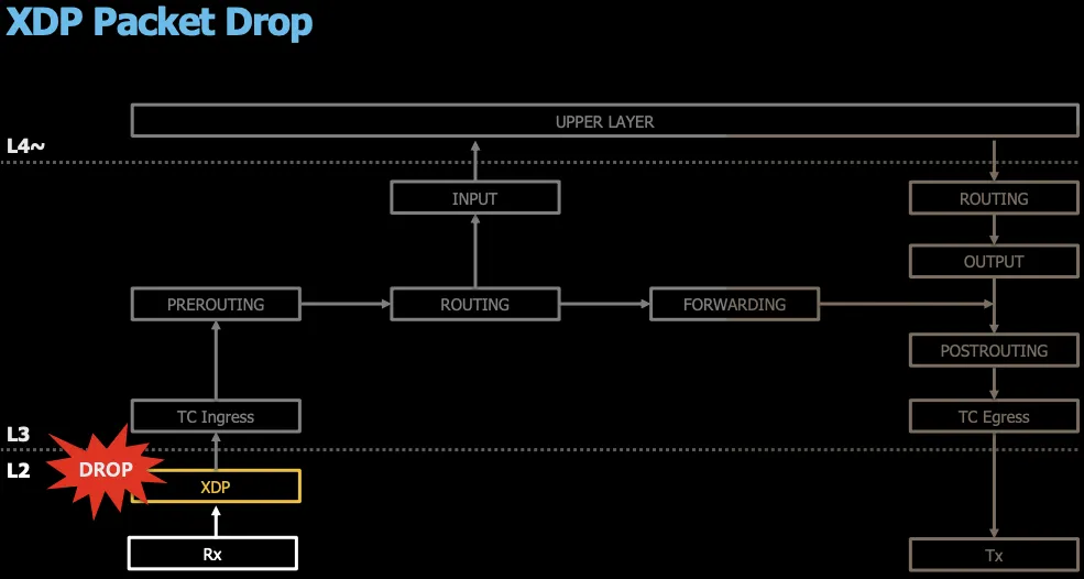 XDP도 Iptables처럼 규칙이 존재하는데, netfilter이상의 계층에서 차단된다면 iptables rule같은 경로를 한번 더 거치게 되는것이니 속도가 느리게 됩니다.
