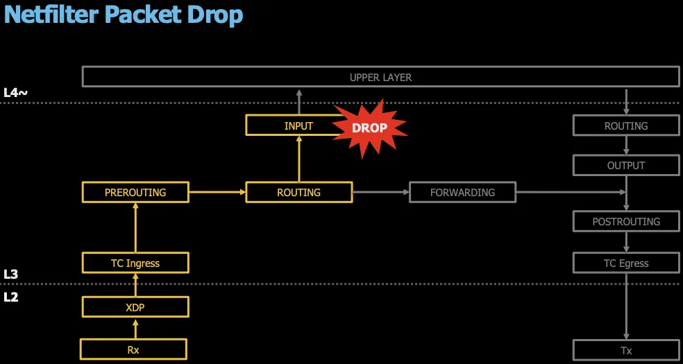 Netfilter에서 차단할 경우, 하드웨어단에서 인입되어 TC Ingress를 걸쳐 Iptable rule에서 차단됩니다.