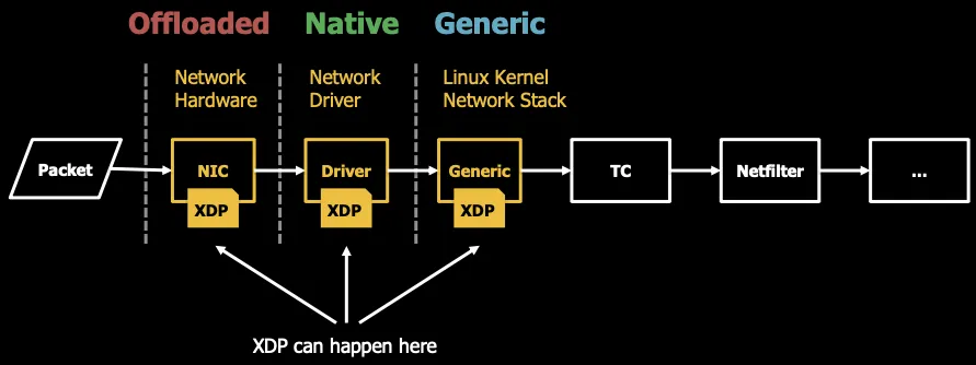XDP에는 Generic(Linux Kernel Network Stack), Native(Network Driver, Intel 등), Offloaded(Network Hardware, Netronome)의 3가지 모드가 존재합니다.