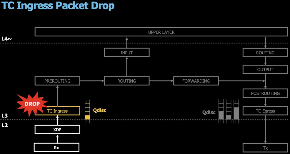 TC Ingress에서 차단할 경우의 경로는 하드웨어단에서 인입되어 L3의 TC Ingress에서 차단됩니다.