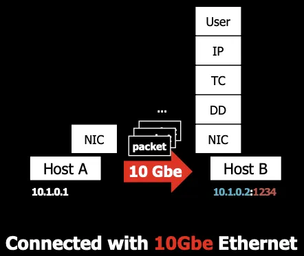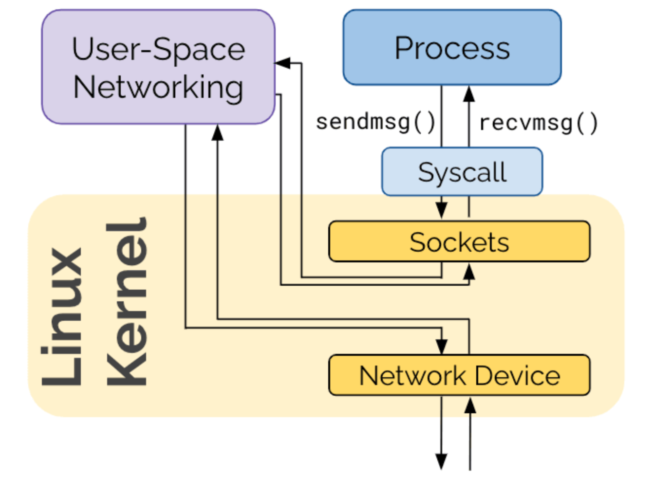 sendmsg()라는 system call을 소켓(TCP나 웹 소켓)에게 전달합니다. 그 후 User-Space의 Networking을 타고 Kurnel의 Nerwork Device를 통해 외부로 전달됩니다. 응답을 받을 때는 반대로 동작하며 socket이 recvmsg()라는 system call을 애플리케이션(Process)에게 전달합니다.