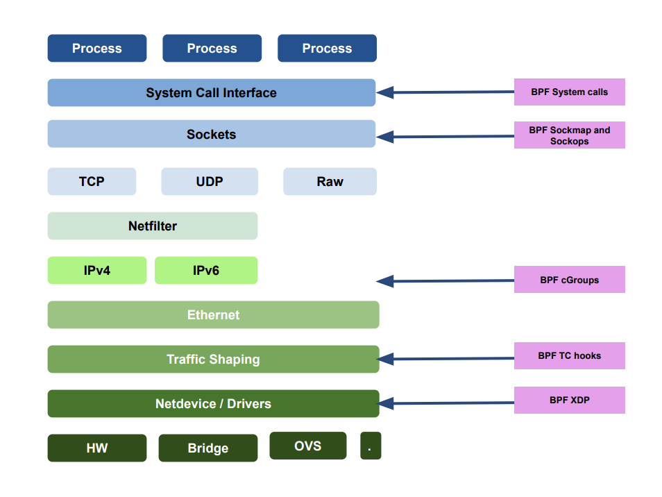 BPF는 커널에 삽입하여 패킷을 통제(필터링) 할 수 있으며, 다양한 영역에서 Hook 을 통해서 접근 할 수 있습니다. 즉, 거의 모든 영역에서 hook을 삽입하여 원하는 대로 통제가 가능해집니다.