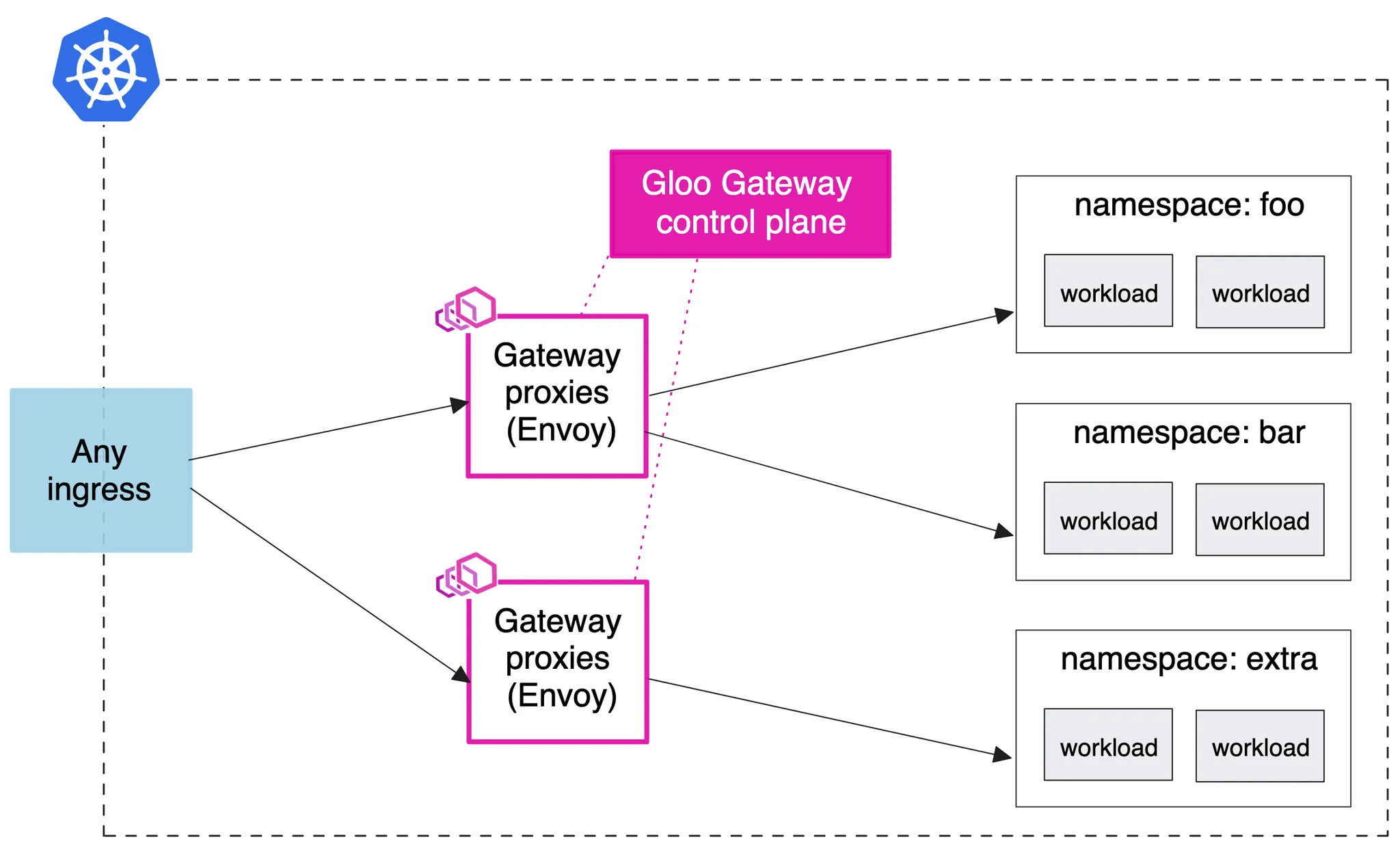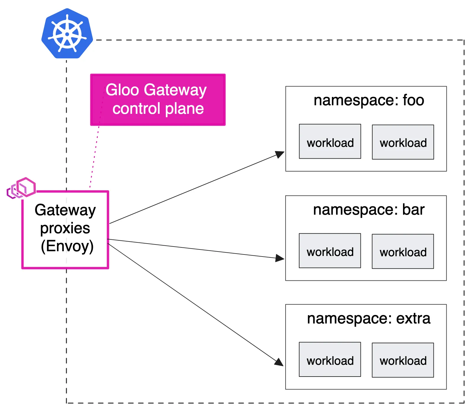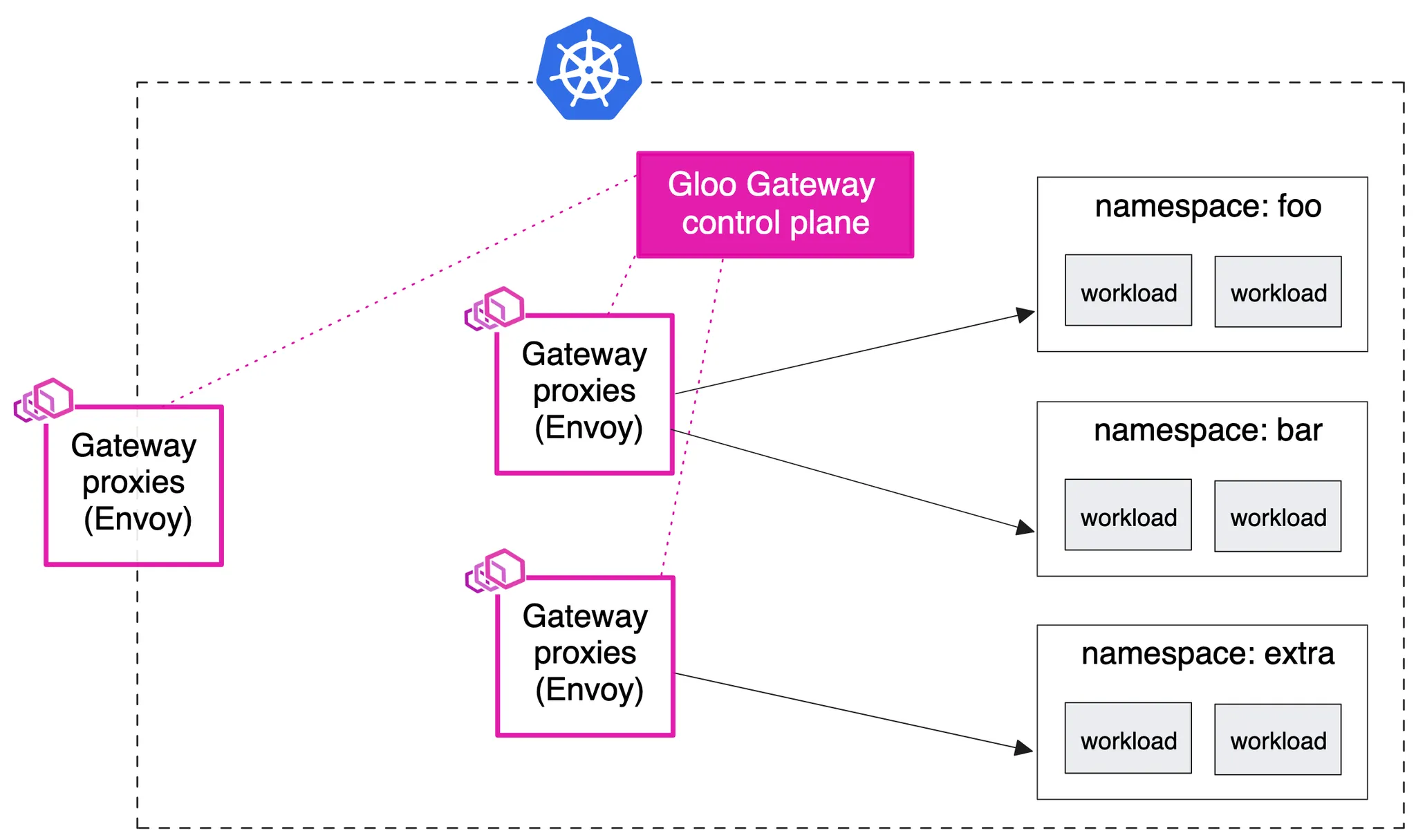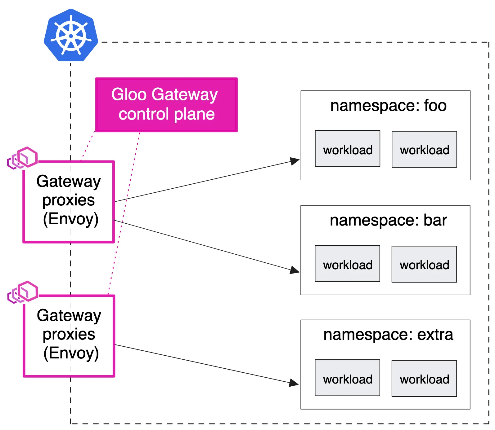 Gateway Proxy는 Gloo Gateway Control Plane에 의해 관리되지만, 첫번째 Gateway Proxy는 foo 및 bar 네임스페이스에 있는 워크로드의 트래픽을 관리하고, 두 번째 Gateway Proxy는 extra 네임스페이스에 있는 워크로드를 위한 전용 API 게이트웨이로 작동합니다.