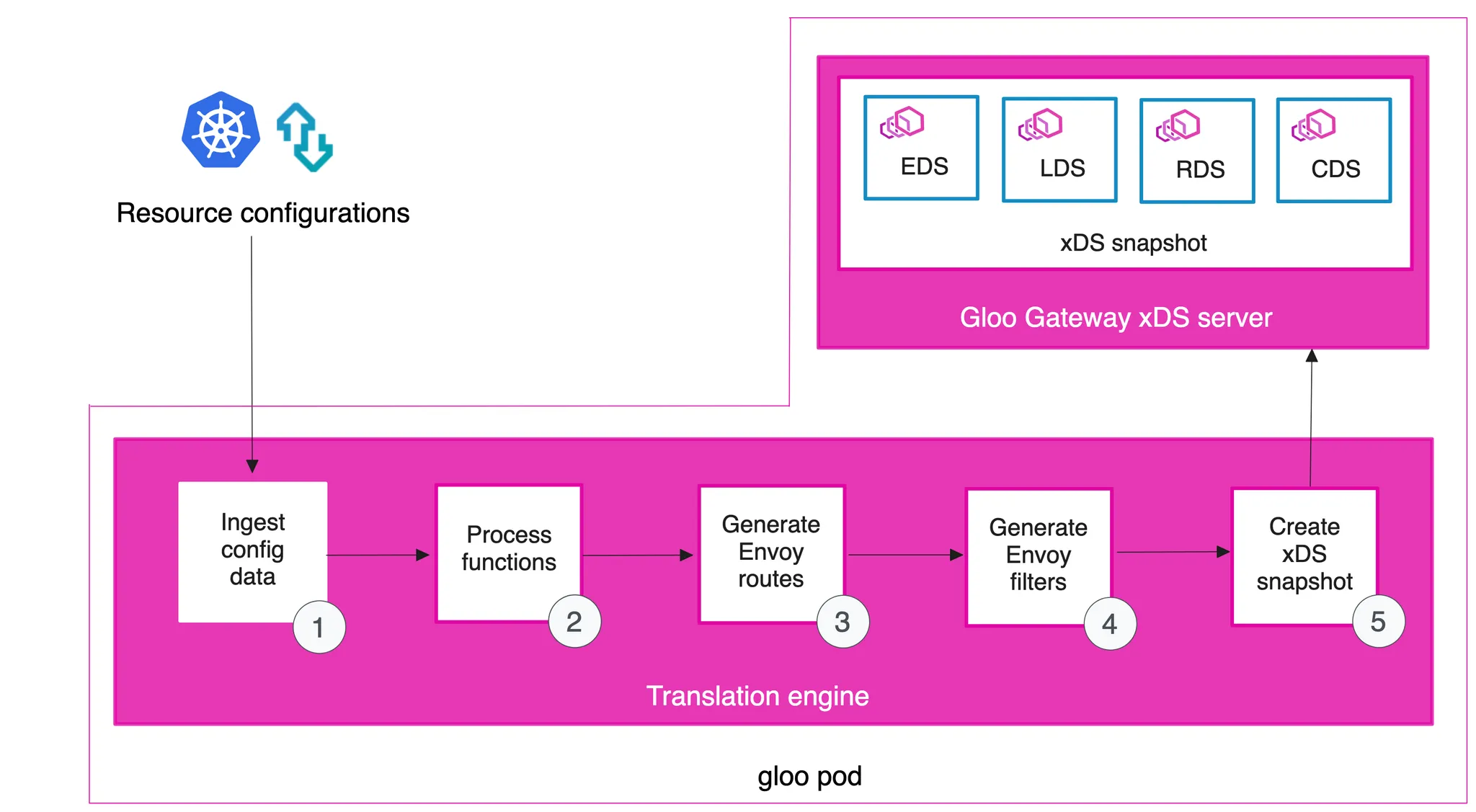 6. xDS 스냅샷은 Gloo Pod 내의 Gloo Gateway xDS 서버 컴포넌트에 제공됩니다.