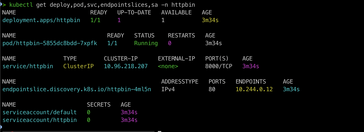 kubectl get deploy,pod,svc,endpointslices,sa -n httpbin