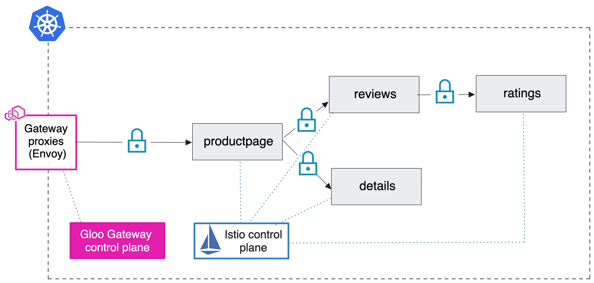 서비스 메시 내의 서비스들은 상호 TLS(mTLS)를 통해 서로 통신합니다. 이때, Gloo Gateway 프록시는 Istio 사이드카와 함께 구성되며, 메시 내의 서비스들과 신뢰할 수 있는 mTLS 연결을 설정할 수 있습니다.