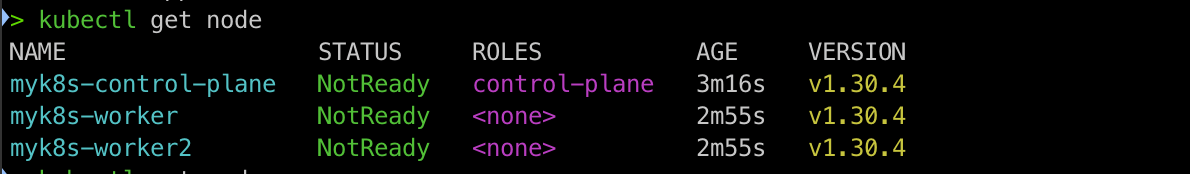 kind create cluster --config kind-cni.yaml --name myk8s --image kindest/node:v1.30.4