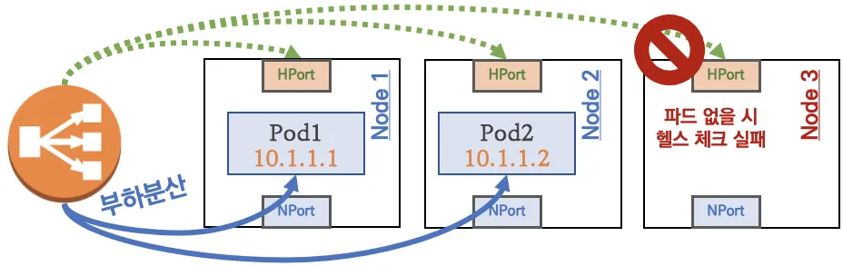 추가로, AWS ELB에서는 부하분산최적화 방법이 있는데, Node에 Pod가 없을 경우 health check(상태 검사)가 실패하여 해당 Node로는 외부 요청 트래픽을 전달하지 않습니다.