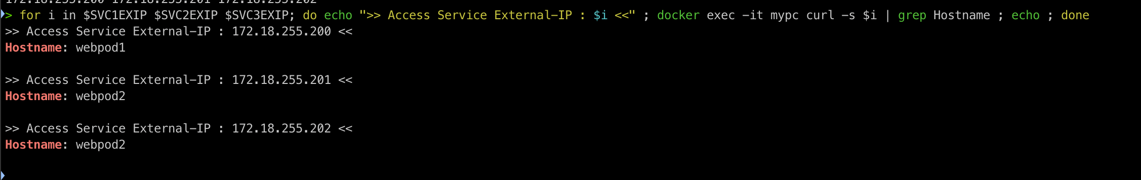 for i in $SVC1EXIP $SVC2EXIP $SVC3EXIP; do echo ">> Access Service External-IP : $i <<" ; docker exec -it mypc curl -s $i | grep Hostname ; echo ; done