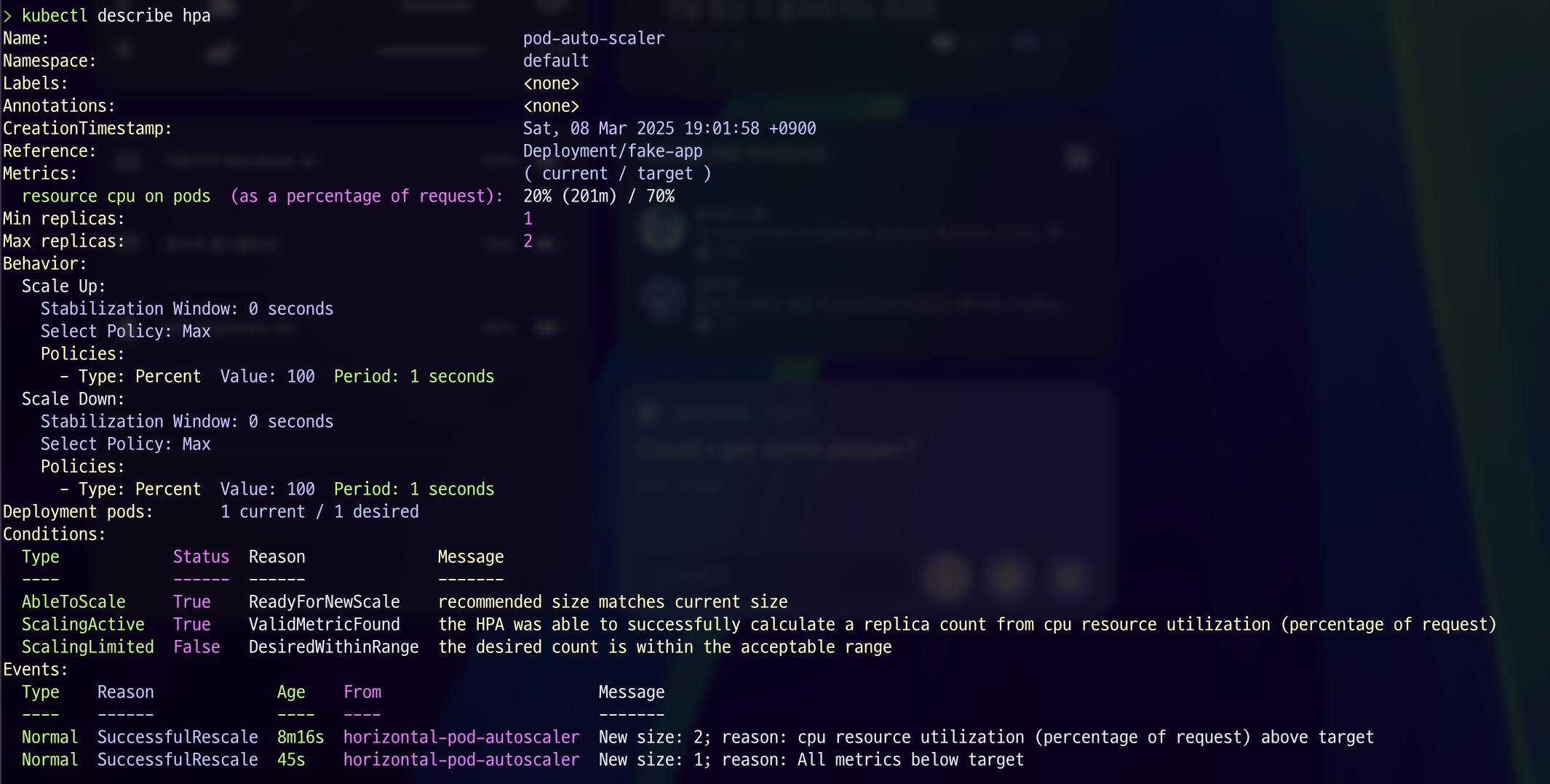정상적으로 HPA가 동작하여 Pod의 개수를 조정했으며, CPU 사용률이 target보다 높아서 HPA가 Pod을 자동으로 확장(Scale Up) 한 것을 알 수 있습니다.