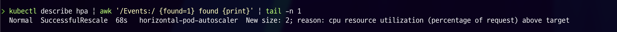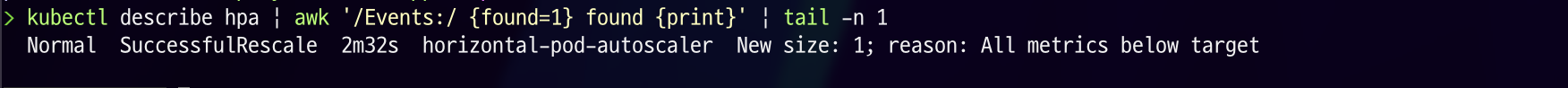 kubectl describe hpa | awk '/Events:/ {found=1} found {print}' | tail -n 1