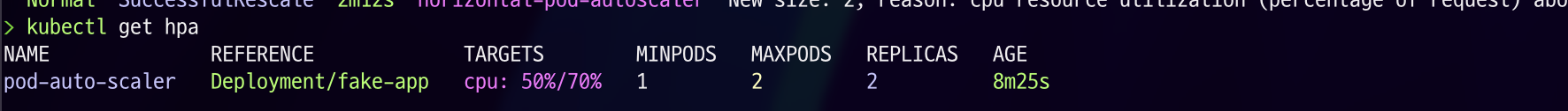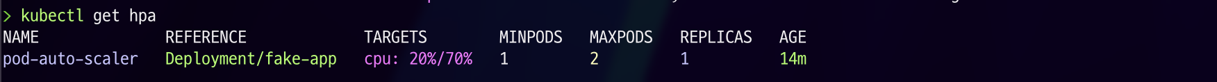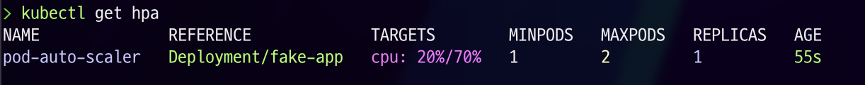 pod-auto-scaler라는 HPA는 fake-app이라는 Deployment에 설정되어 있으며, cpu 사용량이 70%가 되면 동작하고 현재 Replicas는 1인 것을 확인하실 수 있습니다.