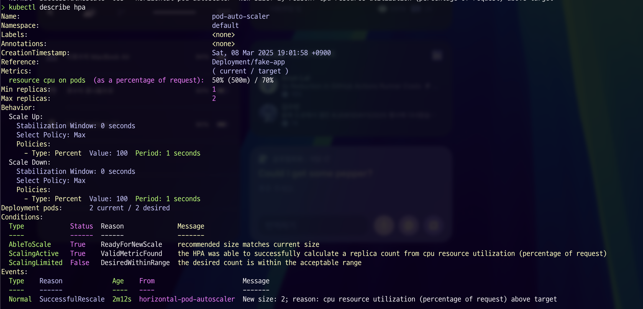 정상적으로 HPA가 동작하여 Pod의 개수를 조정했으며, CPU 사용률이 target보다 높아서 HPA가 Pod을 자동으로 확장(Scale Up) 한 것을 알 수 있습니다.