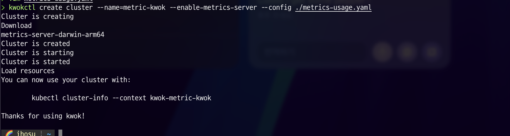 처음 kwok cluster를 생성할 때는 etcd, kube-apiserver, kube-controller-manager 등 필요한 바이너리를 다운로드해야 하기 때문에 시간이 좀 걸릴 수 있습니다.(한 번 다운로드하면 이후 캐싱되어 클러스터 생성 속도는 훨씬 빨라집니다.)