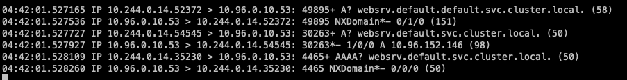 5. websrv.default.svc.cluster.local -> 질의 성공 (총 5회 질의)