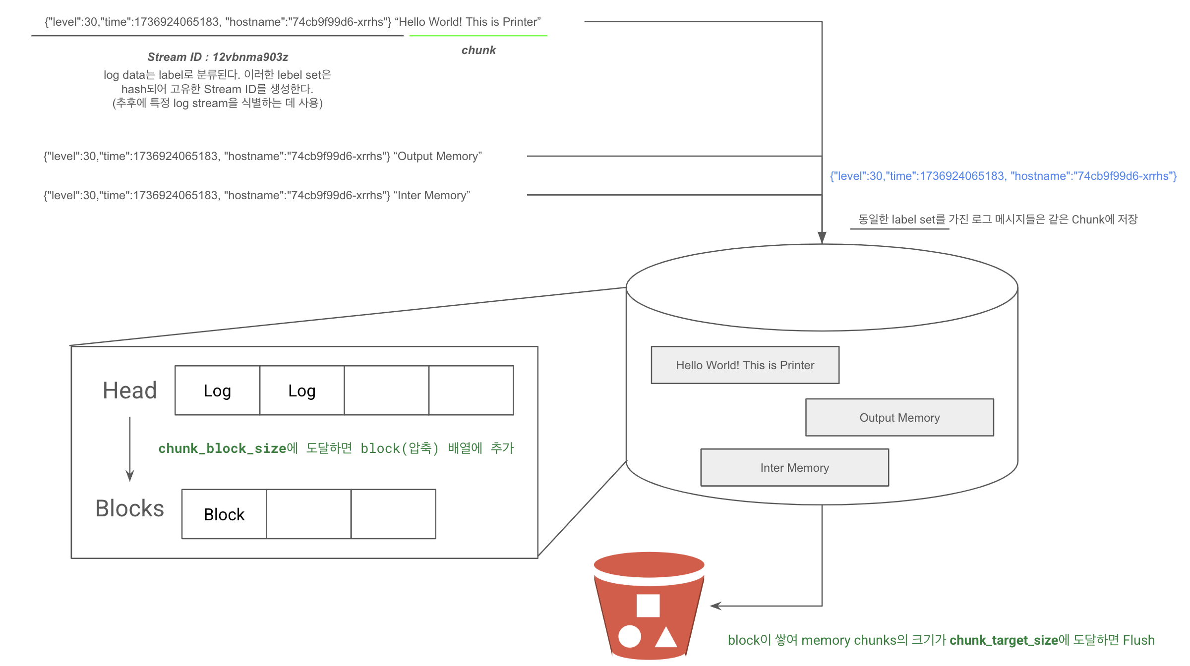 {job="syslog", instance="host1"} 00:00:00 i'm a syslog! 로그와 {job="syslog", instance="host1"} 00:00:02 i'm a syslog! 로그는 label이 같기 때문에 같은 stream 1으로 생성됩니다. 하지만 {job="syslog", instance="host2"} 00:00:01 i'm a syslog! 은 label중 instance의 값이 다르기 때문에 새로운 stream 2로 생성되었고, 후에 {job="syslog", instance="host1"} 00:00:03 i'm a syslog! 은 stream 1, {job="syslog", instance="host2"} 00:00:02 i'm a syslog! 은 stream 2로 생성됩니다.