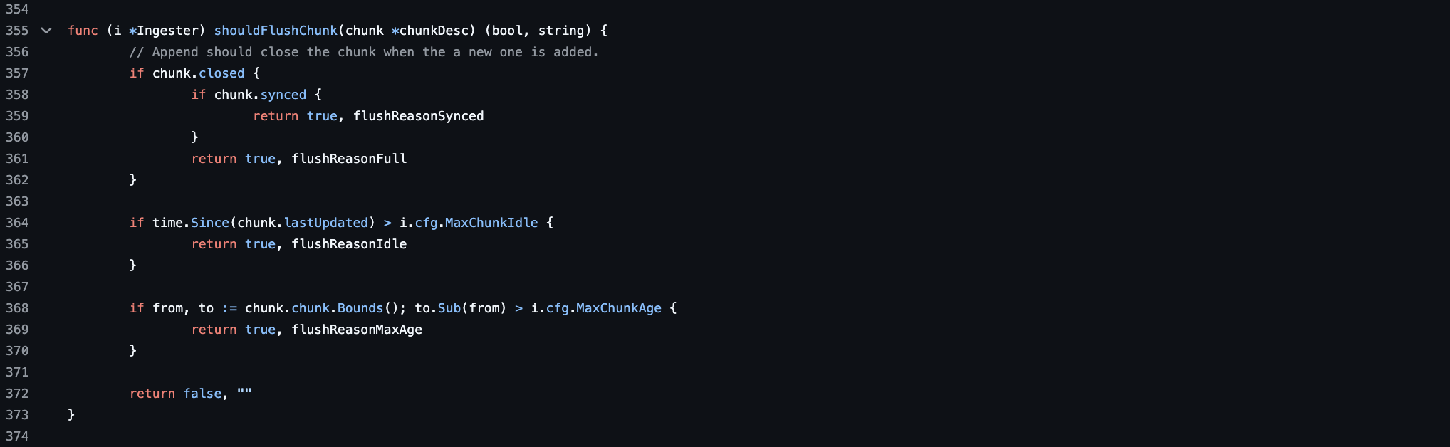 위의 함수는 메모리의 모든 stream을 관찰하고 각 stream의 chunks가 flush 조건과 일치하는지 확인 후 일부 chunk가 일치하면 flushing을 위해 queue에 넣는 함수입니다. shouldFlushChunk 함수는 특정 청크가 플러시(Flush) 조건을 만족하는지를 확인하는 함수이고, sweepUsers 함수는 Ingester를 순회하며 sweepInstance를 호출합니다.