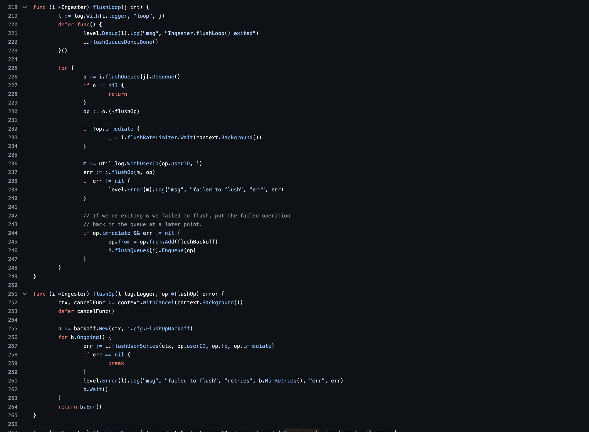 그리고 flushLoop와 flushOp 함수는 flush queue을 관찰하며 대기열에서 Object Storage에 flush합니다. 코드를 살펴보면 i.flushQueues[j].Dequeue()를 호출하여 대기열에서 작업(flushOp)을 꺼내고, 대기열에 작업이 없으면 nil을 반환하고 루프를 종료합니다. 이때, 대기열에거 가져온 작업(flushOp)이 있다면 해당 작업을 i.flushOp(m, op)를 호출하여 처리하고, flush 작업이 실패한 경우(err != nil), 작업을 다시 대기열에 추가(i.flushQueues[j].Enqueue(op))하여 재시도하게 됩니다.