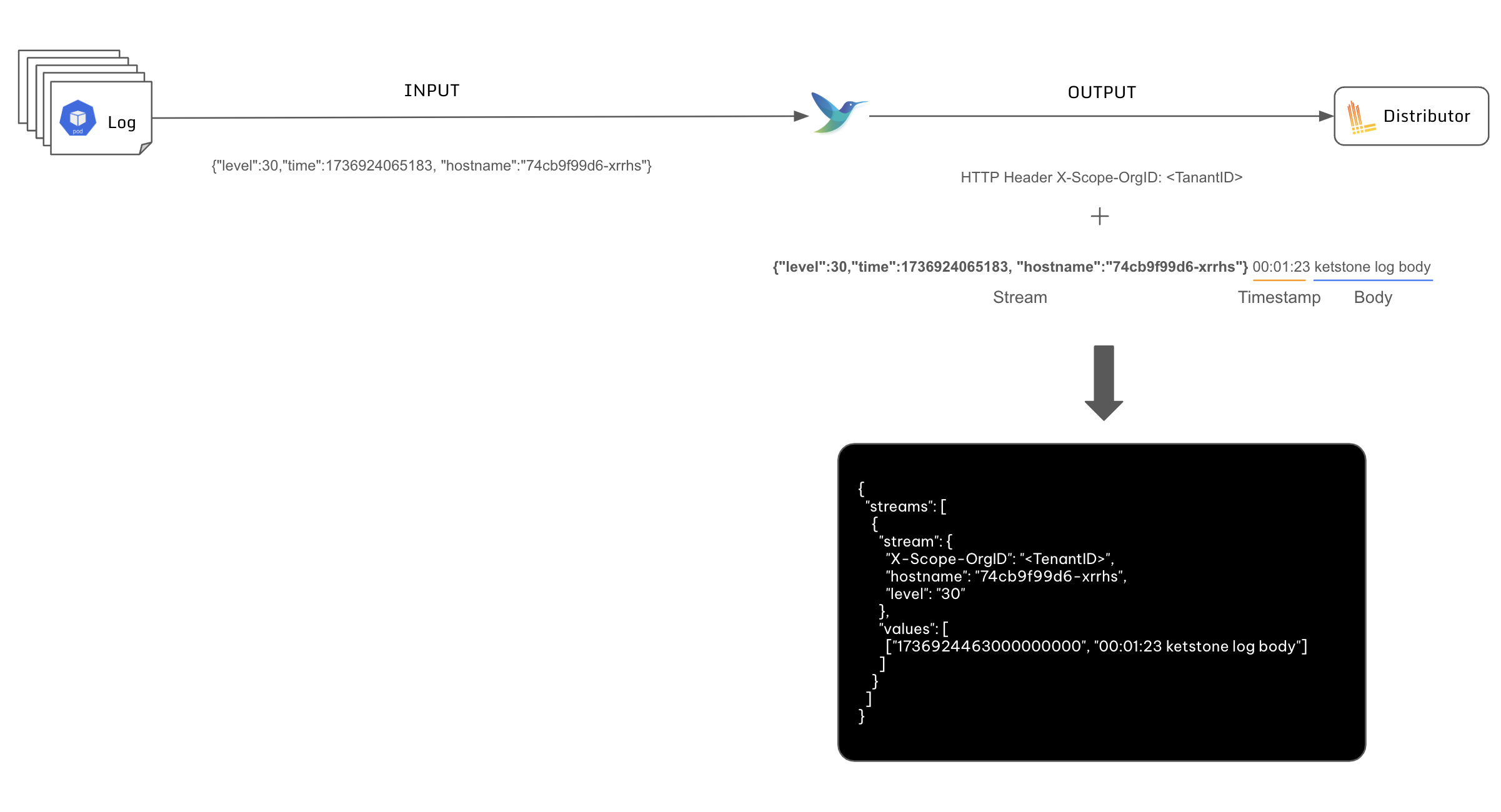 Fluent Bit은 Pod에서 출력된 STDOUT 로그, 예를 들어 {"level":30,"time":1736924065183, "hostname":"74cb9f99d6-xrrhs"} 과 같은 로그를 수집합니다. 그런 다음, 로그에 추가적인 정보를 결합하여 {"level":30,"time":1736924065183, "hostname":"74cb9f99d6-xrrhs"} 00:01:23 keystone log body 와 같은 형식으로 Loki의 Distributor로 전송합니다.