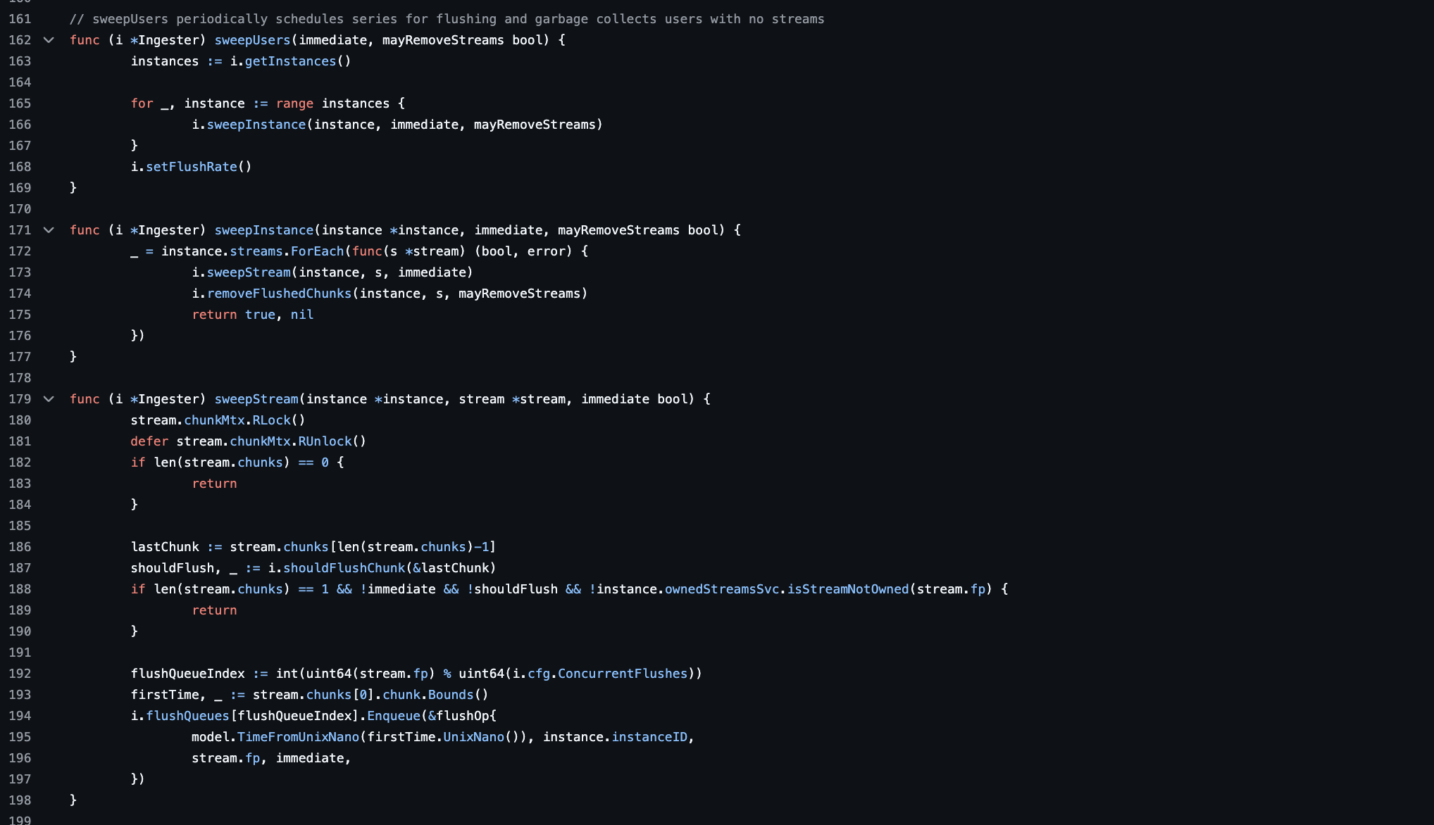 위의 함수는 메모리의 모든 stream을 관찰하고 각 stream의 chunks가 flush 조건과 일치하는지 확인 후 일부 chunk가 일치하면 flushing을 위해 queue에 넣는 함수입니다. shouldFlushChunk 함수는 특정 청크가 플러시(Flush) 조건을 만족하는지를 확인하는 함수이고, sweepUsers 함수는 Ingester를 순회하며 sweepInstance를 호출합니다.