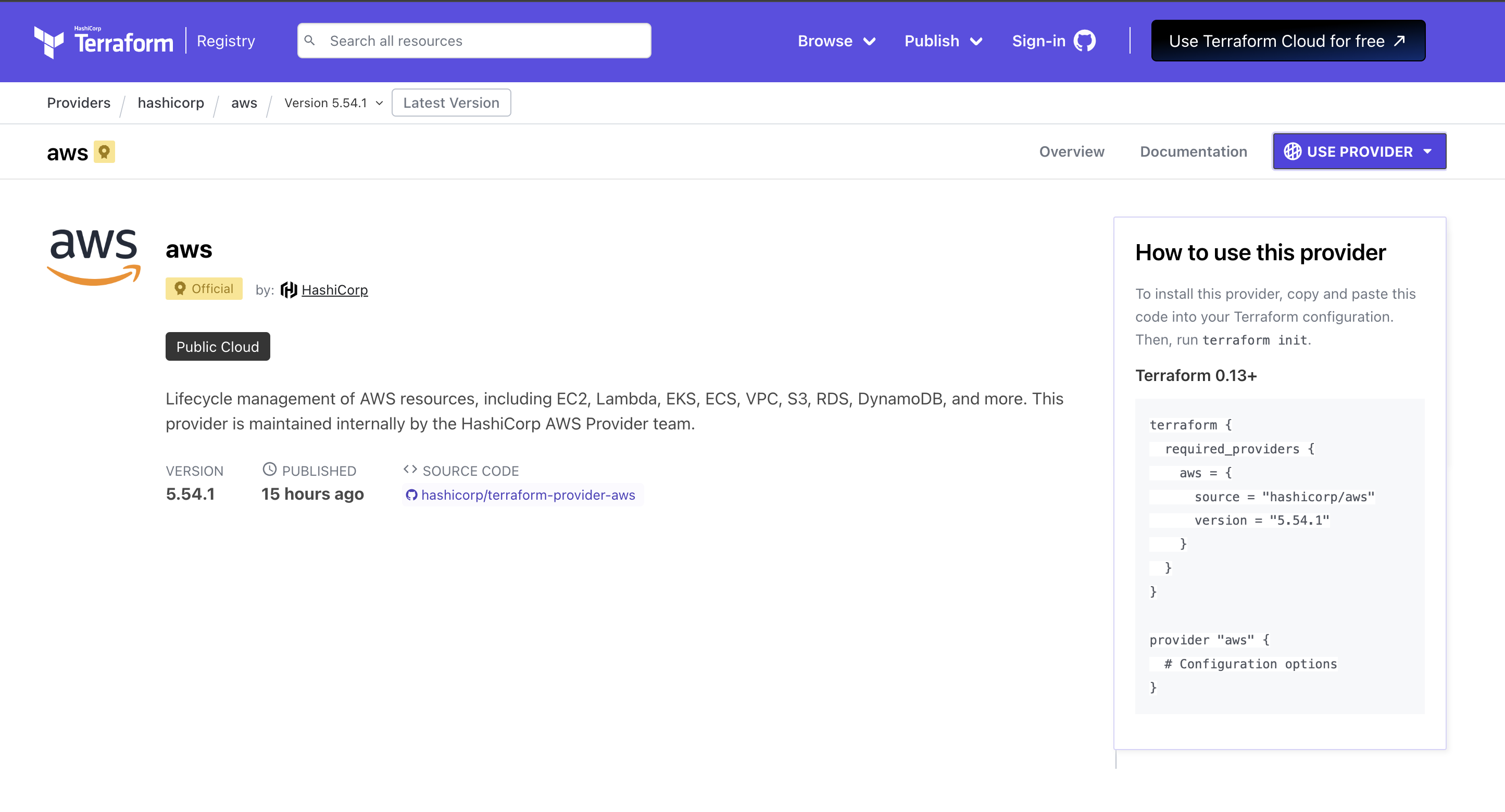각 프로바이더의 이름에 소스 경로와 버전을 명시하며, terraform resitry 공식 페이지에서 원하는 프로바이더를 선택하여 확인하실 수 있습니다.