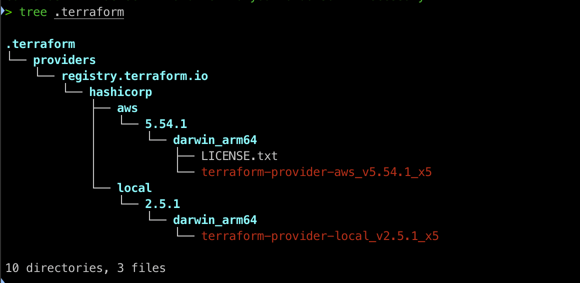 실제로 .terraform/providers의 디렉토리 구조를 확인해보면 aws와 local 프로바이더가 설치되었습니다. 하지만 프로바이더에 따라 접속 정보나 필수 인수를 선언해야 하는 경우가 있으므로 일반적으로는 프로바이더 구성과 함께 사용해야 합니다.