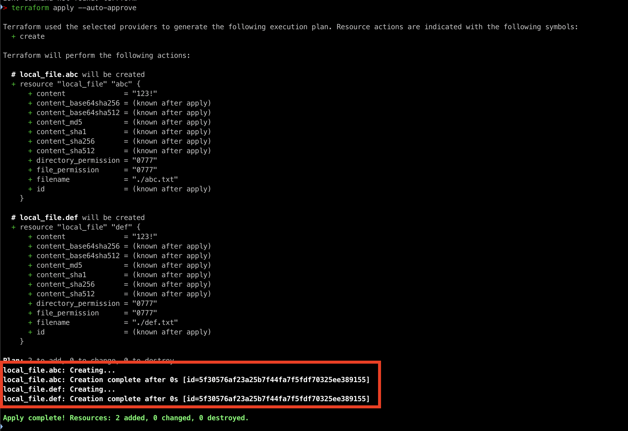 두 리소스는 서로 생성 선후 관계가 없는 동일한 수준의 리소스이므로 테라폼의 병렬 실행 방식에 따라 terraform apply를 수행하면 동시에 생성됩니다.