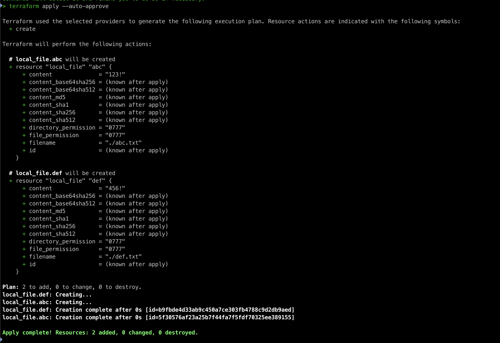 위 예제에서 local_file의 경우 local 프로바이더에 속한 리소스 유형임을 알 수 있습니다. 그리고 abc는 이 리소스의 이름을 나타내고, 중괄호 안에 있는 값인 content와 filename은 리소스 유형에 대한 구성 인수들입니다.