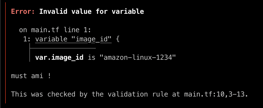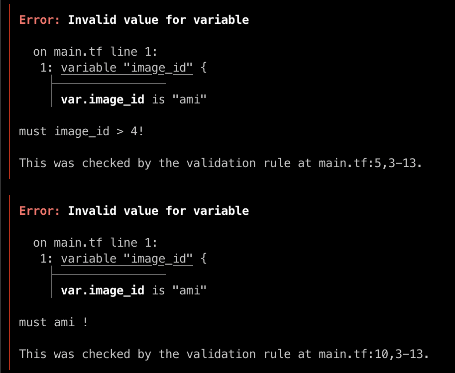 입력되는 변수 타입 지정 외에 terraform 0.13.0 버전 부터 사용자 지정 유효성 검사가 가능합니다. 변수 블록 내에 validation 블록에서 조건인 condition에 지정되는 규칙이 true 또는 false를 반환해야 하며, error_message는 condition 값의 결과가 false인 경우 출력되는 메시지를 정의합니다. regex 함수는 대상의 문자열에 정규식을 적용하고 일치하는 문자열을 반환하는데, 여기에 can 함수를 함께 사용하면 정규식에 일치하지 않는 경우의 오류를 검출합니다. 또한, validation 블록은 중복으로 선언할 수 있다.