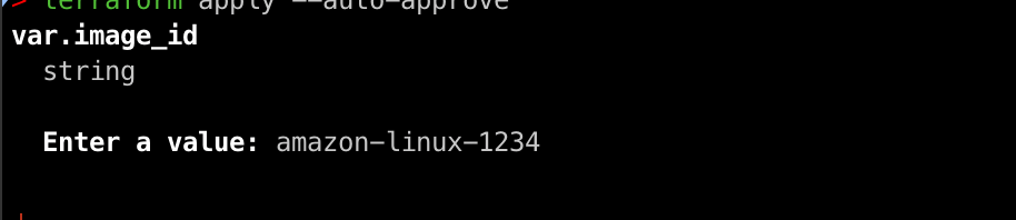 terraform apply 한 후 var.image_id에 대한 값을 입력받는 프롬프트가 활성화됩니다.