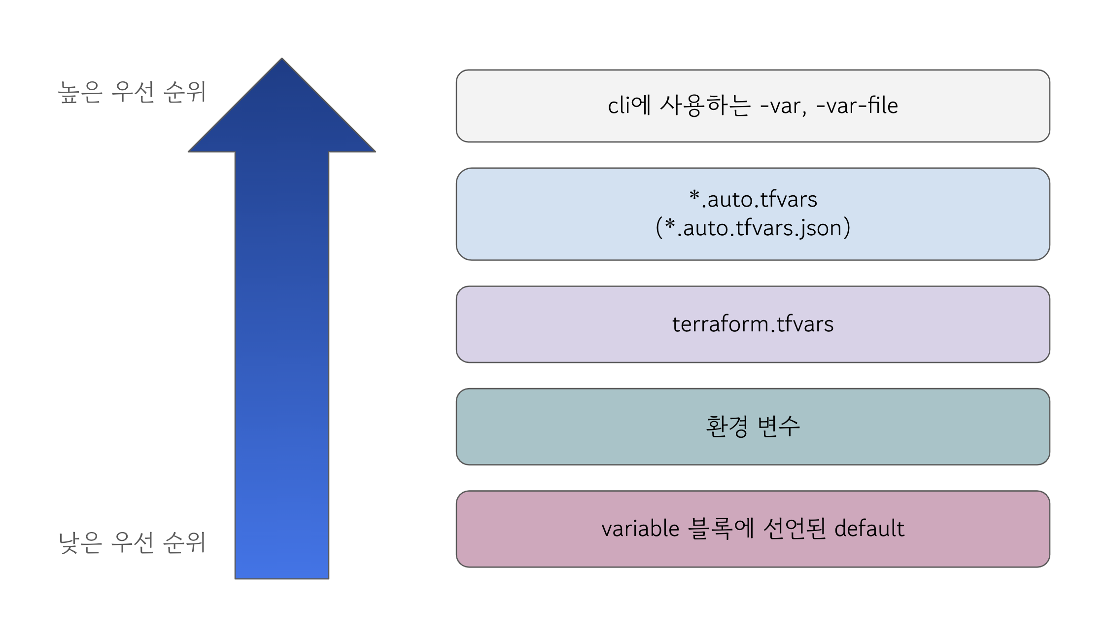 variable의 목적은 코드 내용을 수정하지 않고 테라폼의 모듈적 특성을 통해 입력되는 변수로 재사용성을 높이는 데에 있습니다. 특히 입력 변수라는 명칭에 맞게 사용자는 프로비저닝 실행시에 원하는 값으로 변수에 정의할 수도 있습니다. 또한, 선언되는 방식에 따라 변수의 우선순위가 있으므로 이를 적절하게 사용하여 로컬 환경과 빌드 서버 환경에서의 옵션을 다르게 하거나 프로비저닝 파이프라인을 구성하는 경우 외부 값을 변수에 지정할 수도 있습니다.