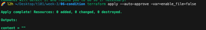 -var 인수를 제거하여 terraform apply를 실행하면 코드에 명시되어 있는대로 enable_file의 값이 true로 할당되어 foo.bar 파일이 생성되고 output으로 content = "foo!"가 보여지는 것을 확인하실 수 있습니다.