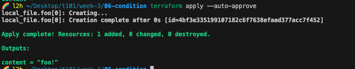 -var 인수를 제거하여 terraform apply를 실행하면 코드에 명시되어 있는대로 enable_file의 값이 true로 할당되어 foo.bar 파일이 생성되고 output으로 content = "foo!"가 보여지는 것을 확인하실 수 있습니다.